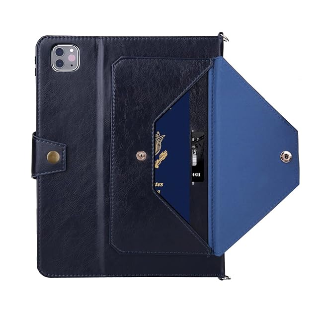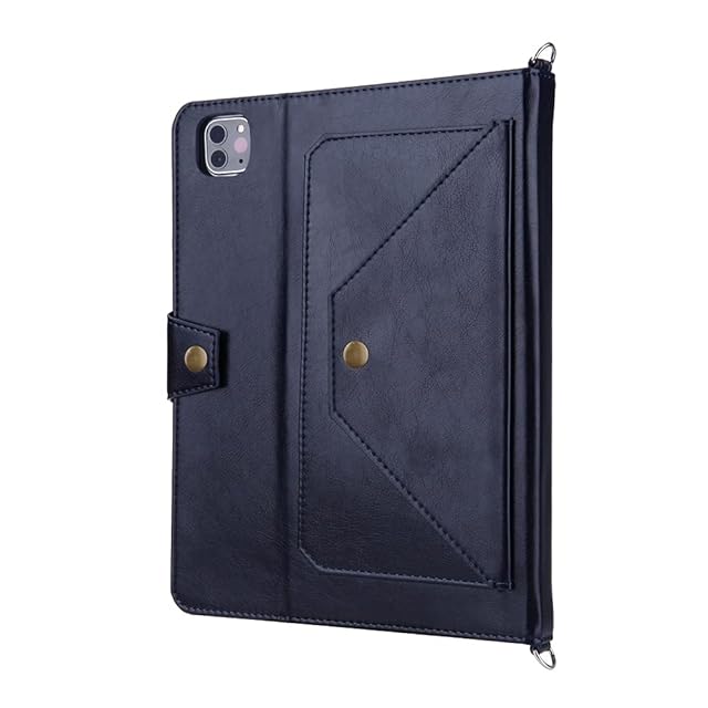 For 2024モデルiPad Pro 11インチ封筒型ケース手帳型iPad Pro 11第5世代ショルダーストラップ付 斜め掛けApple Pencilワイヤレス充電対応オートスリープ カード収納 紙幣収納スタンド機能伸縮性ハンドストラップ 片手タブレットPCケース【MYH】アイパッド プロ11インチ2024高級PUレザー製ビジネス女性と男性安心感 落下防止傷つけ防止多機能ケース(ネイビー)