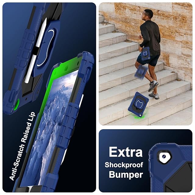 360°旋回 iPad 10.2インチ 第 7 8 9 世代 ケース 取っ手 子ども キッズ 頑丈 iPad7 iPad8 iPad9 カバー 持ち手付き 回転式 キックスタンド ハンドストラップ シリコン アウトドア 横置き 縦置き ペンホルダー付き多機能 耐衝撃 カバー,ネイビー+黒