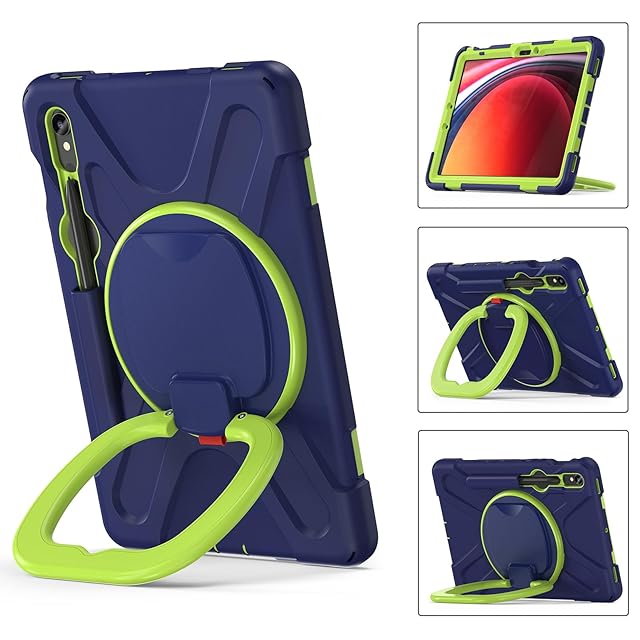 360°回転 Galaxy Tab S9 FE 10.9インチ ケース 斜め掛け Galaxy Tab S9 /S8 / S7 11インチ Android タブレットケース Sペン収納 リングスタンド 子供 頑丈 シリコン ショルダーストラップ (Tab S9FE/S9/S8/S7, ネイビー緑)