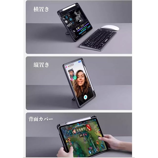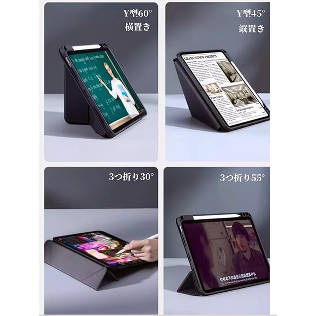 【様々な折り方ができるフロントカバー】カバーにある折り目に沿って折ることで、スタンドとして使用できます。様々な角度に変えられるため、動画鑑賞やイラスト制作などの目的に応じた角度に調整が可能です。安定感も抜群で使いやすい。オートスリープ機能付き。