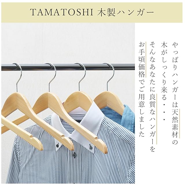 【高品質】徹底した品質管理を行い、高品質で上質な天然木によって作られた木製ハンガー。木材の割れやバリや光沢の剥げなどの不良点の有無の細かくチェックして不良品を極力排除しております。天然木の風合いや木目を生かしたまばらな塗装でアンティーク調に仕上げた木製ハンガー。