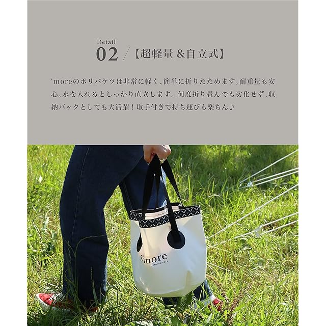 【超軽量&自立式】S'moreのポリバケツは非常に軽く、簡単に折りたためます。耐重量も安心。水を入れるとしっかり直立します。 何度折り畳んでも劣化せず、収納バックとしても大活躍!取手付きで持ち運びも楽ちん♪