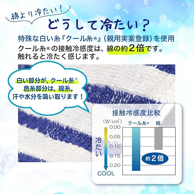 【 触れるとひんやり 】 接触冷感度が綿の2倍以上ある、クール糸を織り込んで作ったタオル。水にぬらさなくても触れるだけでひんやりと冷たく感じます。