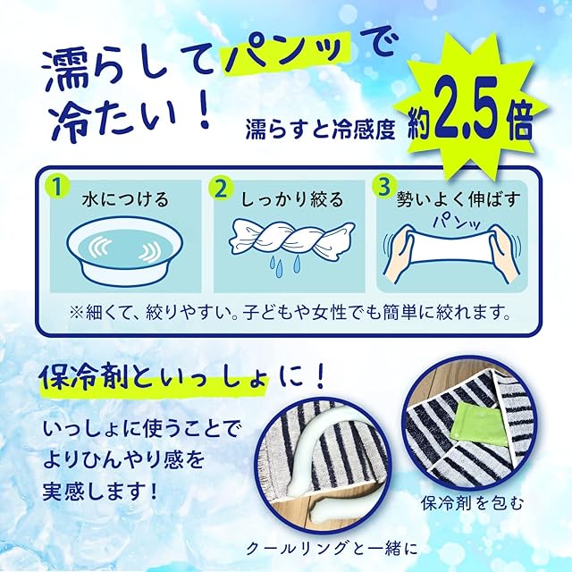 【 さらに冷感アップ 】 触れるだけでひんやりしますが、水にひたしたり 保冷剤を一緒に使用することで、さらに冷感の効果が得られます。