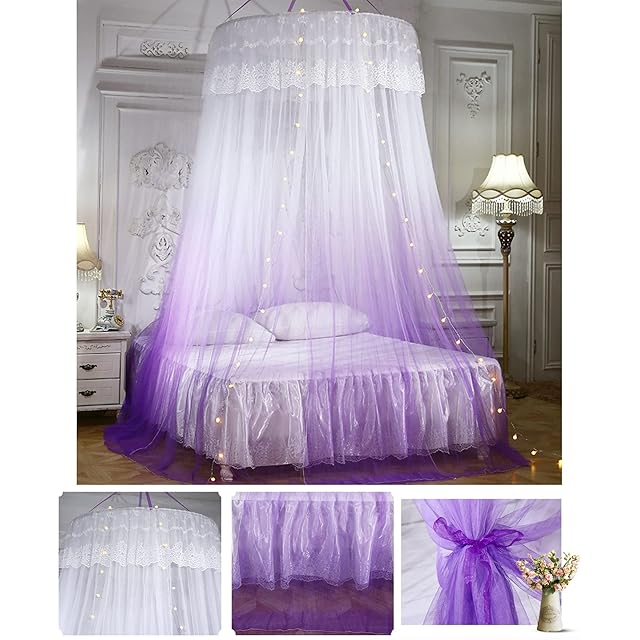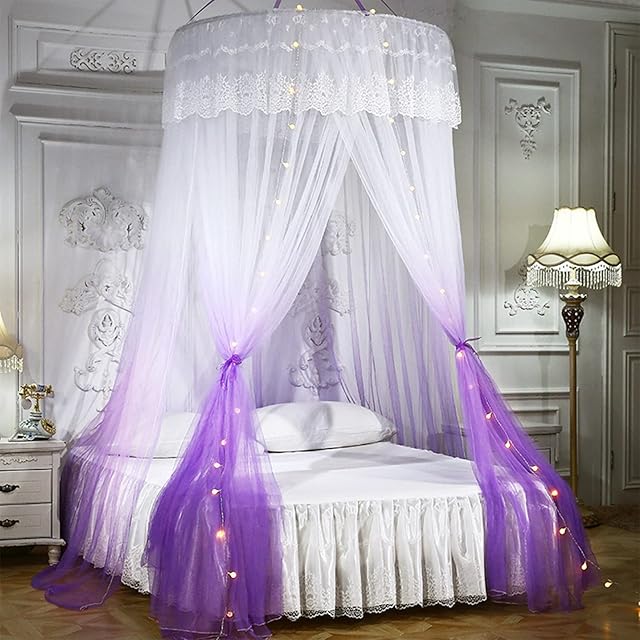 Yangweng 蚊帳 天蓋 吊り下げタイプ 天蓋カーテン 防蚊 昆虫防ぐ 円形蚊帳 ベッドカーテン 部屋飾り モスキートネット 大人用 赤ちゃん用 お姫様 ベッド ソファ 畳 取り付け簡単 LEDライト付き 人気 おしゃれ パープル ベッド幅1.5m
