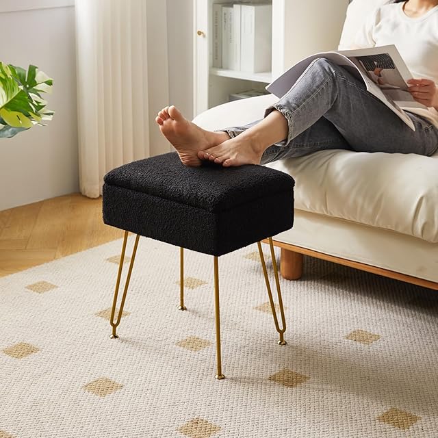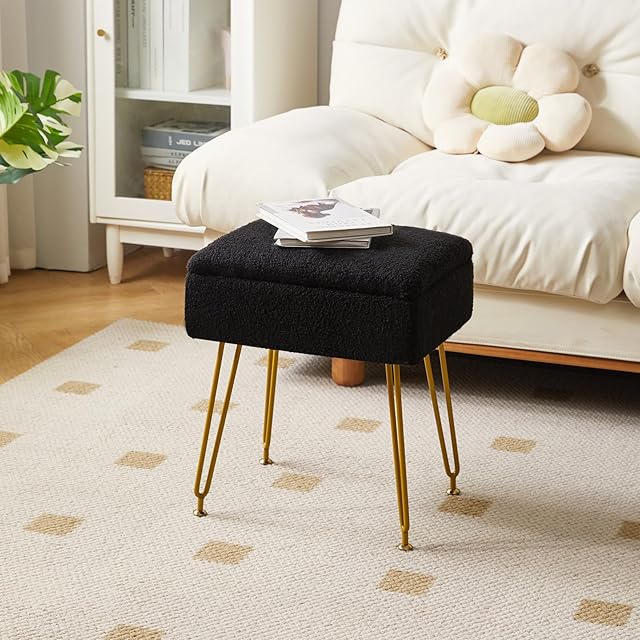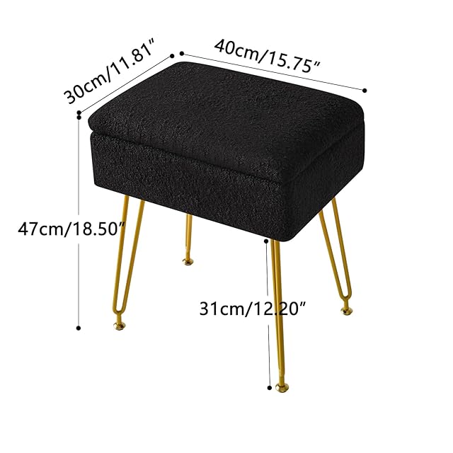 YMYNY オットマン, 収納オットマン、椅子スツール布張り、テディベア材質、ドレッシングテーブルスツール、プーフカウチスツール、金属脚、取り外し可能なカバー、リビングルーム、ベッドルーム用、40×30×47CM ブラック JPHBD031B