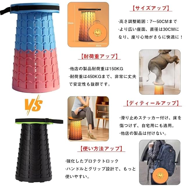 【サイズアップ】収納サイズ:30*30*7cm 使用時:30*30*50cm 高さ調整範囲:7~50cmまで 重さ:1.5kg 最大荷重:450kg 製品内容:折りたたみいす本体、クッション、カラビナスツールは一瞬に引き出すことができ、超便利です。改進した第八代の折りたたみ椅子の高さは50cmまで、直径は30cmになり、座面を広げたバージョンは以前より座り心地がさらに快適に!