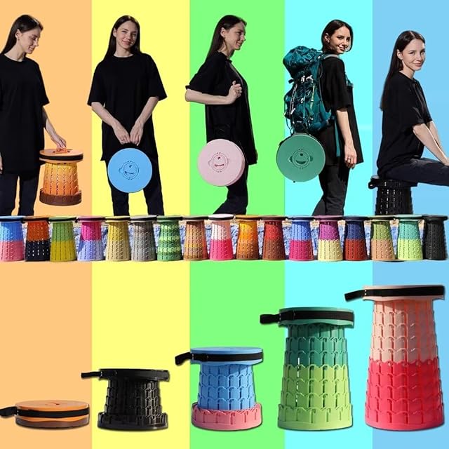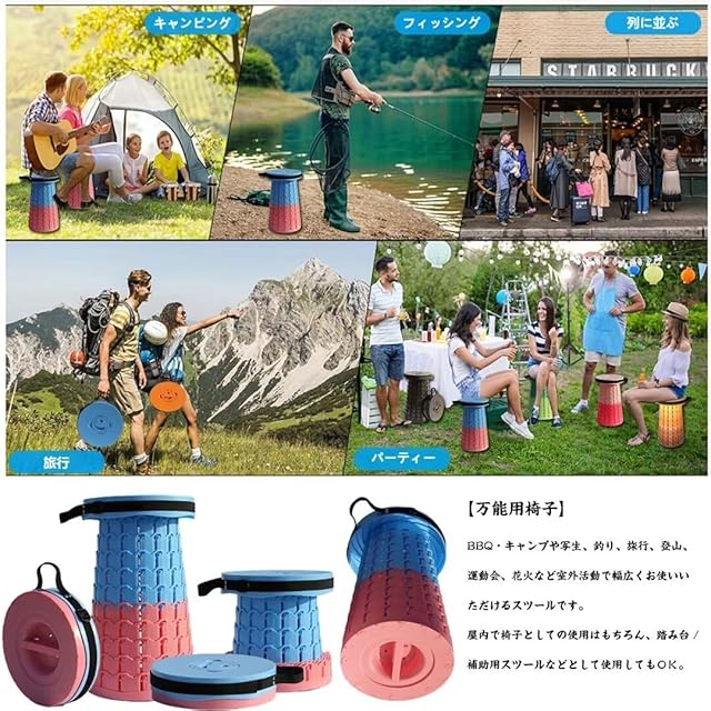 【多様なシーンに適用】簡単に好きなサイズに伸縮自在のポータブルスツールで、BBQ・キャンプや写生、釣り、旅行、登山、運動会、花火など日常でも幅広くお使いいただけるスツールです。屋内で椅子としての使用はもちろん、踏み台 / 補助用スツールなどとして使用してもOK。また、地震や水害などでの避難の時の防災グッズとしても使えます。
