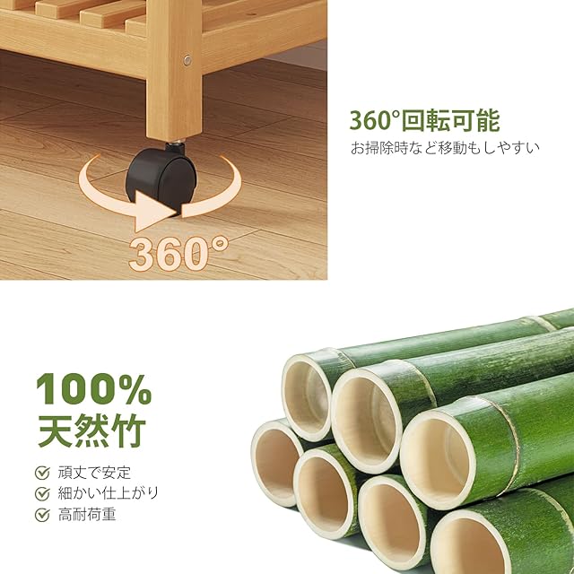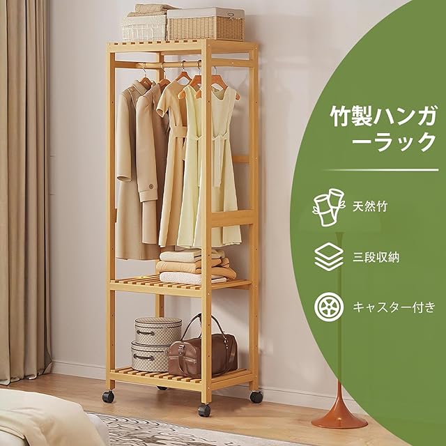 Huaniun ハンガーラック キャスター付き スリム 竹製 3段棚板付き 大容量 洋服ラック 見せる収納 コート掛け 洋服掛け 省スペース 幅43×奥行34×高さ160cm
