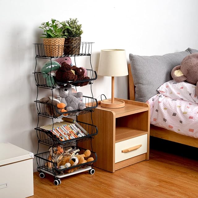 Toplife キッチンバスケットワゴン キャスター付き 野菜ワゴン 5段 スタッキングバスケットラック トレイ付属 キッチン収納カート 食器 調味料 収納 バスルームワゴン 黒
