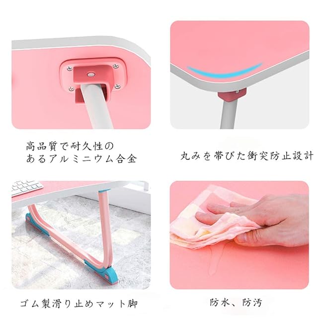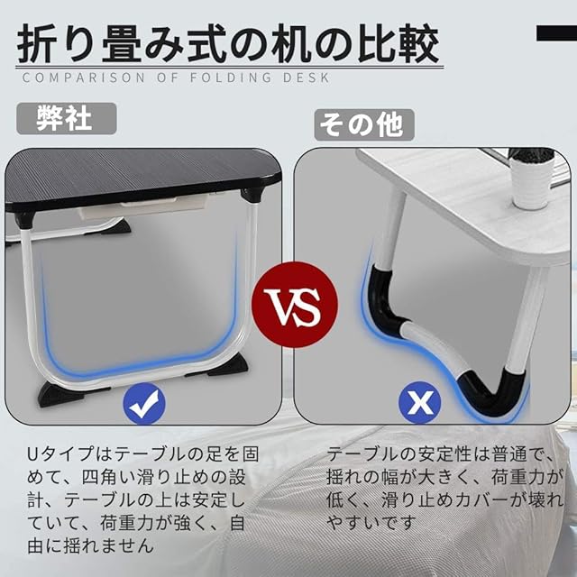 【安定性高い*汚れに強い】U字型の脚は、高品質で耐久性のあるアルミニウム合金フレームで設計されており、底部の滑り止めをサポートします. 低いテーブル脚の4つの保護パッドは、頑丈で安定しており、しっかりしています。床が花で分離されないようにするコンピューターデスク。折りたたみテーブルの角は丸みを帯びており、お子様連れのご家族で安全に使用できるように設計されています。熱や汚れに強い加工で、簡単にきれいに、タオルやペーパータオルを使うだけです、あなたはきれいにデスクトップを拭くことがで きます。