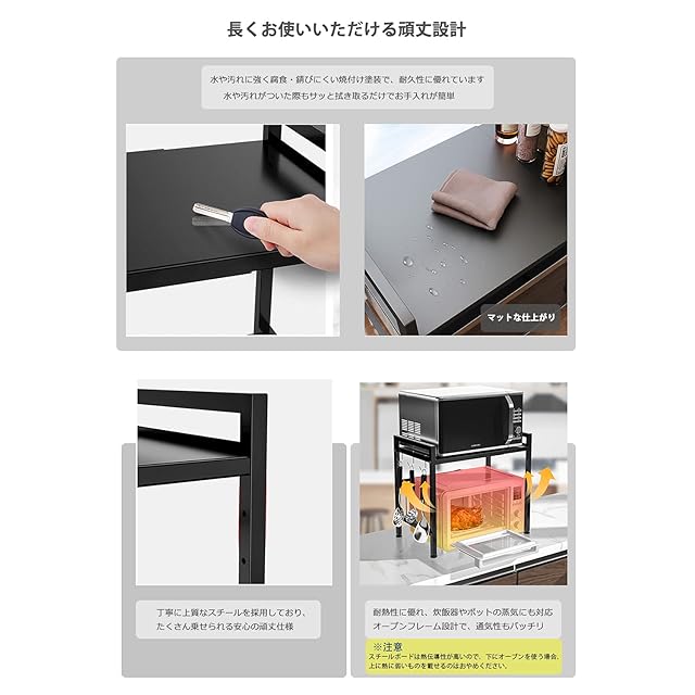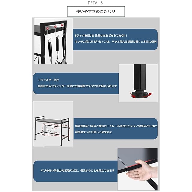 ✅【長くお使いいただけることを実現している3つのポイント】①高耐荷重·頑丈設計▶上質なスチールを採用しており、たくさん乗せられる安心の頑丈仕様です。総耐荷重は伸縮ボードの伸長につれて減ります。最小幅40㎝の場合、総耐荷重は約70㎏。最大幅60㎝の場合、約20㎏になります。予めご了承くださいませ。 ②腐食しにくい仕上がり▶本体はスチールに錆びにくい粉体塗装を施しており、水や汚れがついた際もサッと拭き取るだけでお手入れが簡単。 ③機能性とデザイン性を両立した設計▶幅調整用のつまみや補強ガードレールは目立ちにくい背面のみに付け、前面はすっきり美しい見栄えに。また、側面·背面は支障の無いオープンフレーム設計で、カウンター上などの高い位置に置いても圧迫感を感じにくく、通気性もバッチリ。