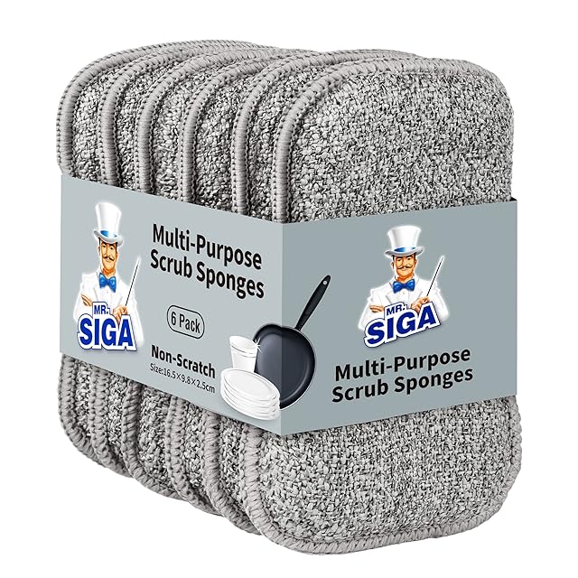 吸水性に優れ、傷がつきません。この傷がつきにくいスポンジは、水を素早く吸収することができ、食器洗いやキッチン用品の洗浄、カウンターや食べこぼしの拭き取りに最適です。各パッドのサイズは長さ×幅16.5×10cm、厚さ2.5cmです。 両面スクラブスポンジ: 片面がマイクロファイバークロス、片面がPP素材含みの編み物のスクラブ面になっています。マイクロファイバー面は食器洗いに最適で、スクラブ面は頑固な汚れや油、シミを落とすタワシのような役割を果たし、ノンスティック調理器具にも安全に使用できます。 人間工学に基づいた快適なグリップ。適度な大きさで手になじむカーブデザインなので、手で持ちやすく電子レンジやお皿、鍋やフライパンの油汚れやカスをこすり落とすことができます。 再利用可能&長持ち - こちらのキッチンスポンジは緻密な縫い目、補強された縁が特徴で、何百回もの洗濯に耐えるつくりです。 MR.SIGAのミッション:家事をより手軽に、世界をより清潔に。製品に関する質問がある場合、ぜひとも弊社へご連絡のほど宜しくお願いいたします。 我々は何時もお客様のために、サポートをご提供いたします。