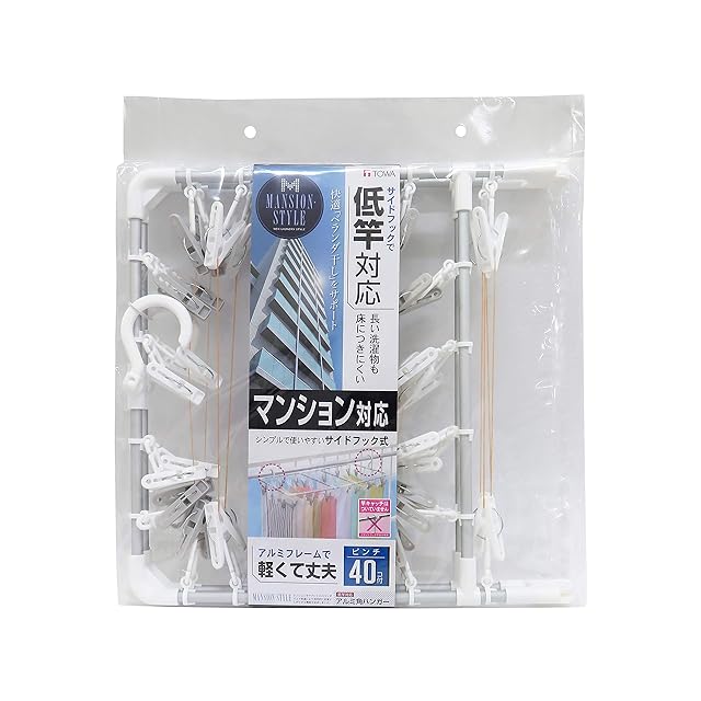 東和産業 ポリプロピレン 洗濯 物干し ハンガー アルミ角ハンガー MS低竿対応 ピンチ40個付 ホワイト 約37.5×74×18cm