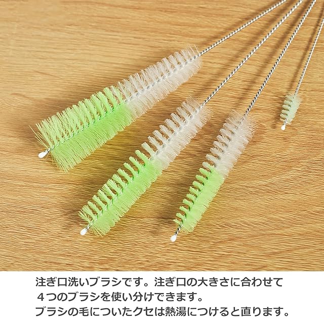 注ぎ口洗いブラシです。 注ぎ口の大きさに合わせて4つのブラシを使い分けできます。ブラシの毛についたクセは熱湯につけると直ります。