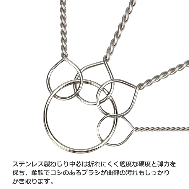 ステンレス製ねじり中芯は折れにくく適度な硬度と弾力を保ち、柔軟でコシのあるブラシが曲部の汚れもしっかりかき取ります。