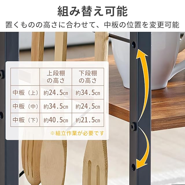 【ヴィンテージ調のおしゃれなデザイン】 ブラックのフレームと木目の組み合わせが落ち着いた雰囲気。 3段のサイドオープンデザインで下段のものも取りやすいので、日常的に使いやすいデザイン。 コーヒースタンドや、キッチングッズ、またはインテリア用品や植物などグリーンを置いても映えます。