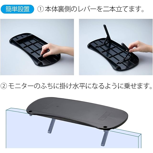 設置可能モニターサイズ:天面の奥行/70mm未満、取付面の奥行/6~90mm、横幅/260mm以上(モニター前面から背面へ15cm以上のスペースが必要です。また、モニターのフチに引っかけて取り付けるため、フチに10mm以上の平らな面が必要となります)