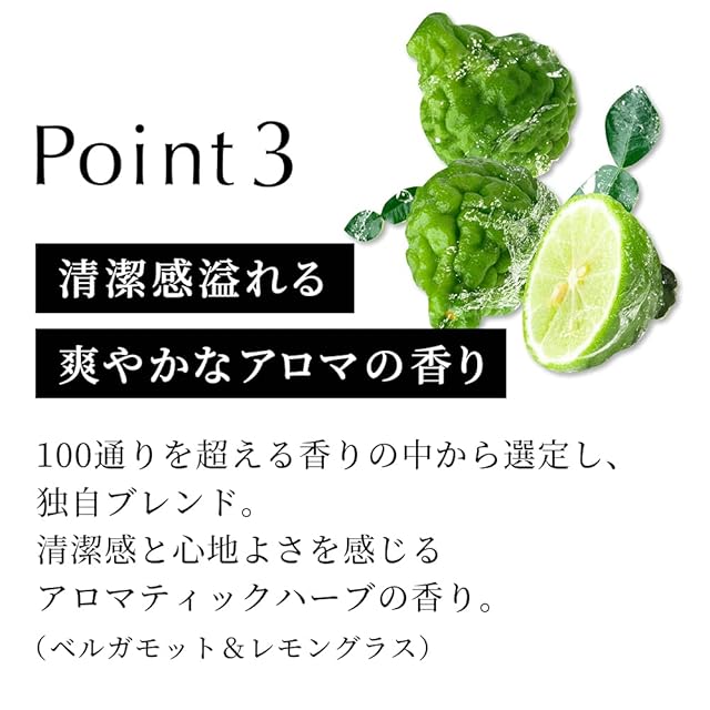 清潔感溢れる爽やかなフレグランス 100通りを超える香りの中から選定し、独自ブレンド。 清潔感と心地よさを感じるアロマティックハーブの香り。 (ベルガモット&レモングラス) 香水のように時間が経つごとに変わっていく香りを ラストノートまでお楽しみください。
