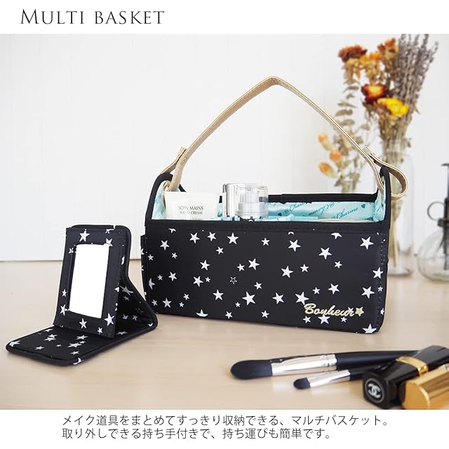メイクグッズだけでなく、散らかりがちな机の上の小物類の収納にも便利です。取り外しできる持ち手が付いて、移動や持ち運びも楽にできます。柄は黒字に白い星柄。星がちりばめられたスター柄と、内側の水色が可愛いデザインです。