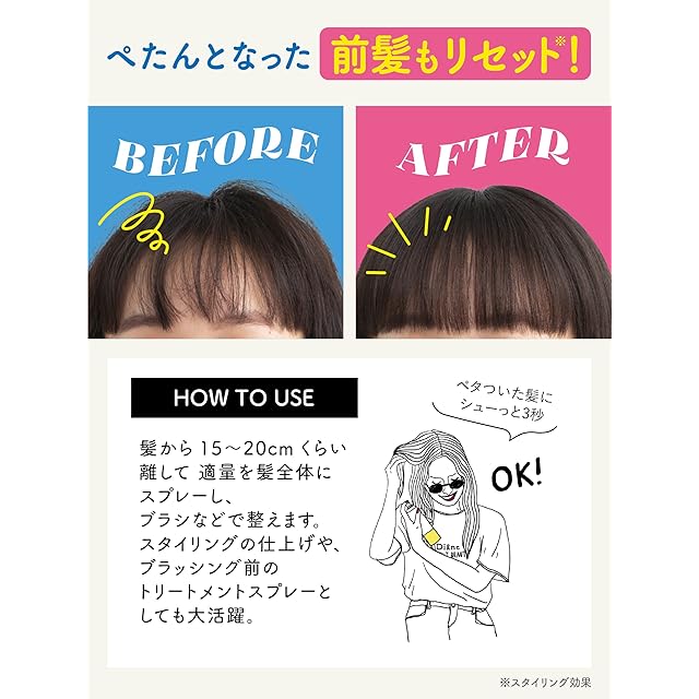 【瞬間リフレッシュ&スタイリング】汗や皮脂によるベタつきを抑え、サラサラふんわりスタイリングをキープします。スタイリングの仕上げや、ブラッシング前のトリートメントスプレーとしても大活躍。髪から15~20cmくらい離して適量を髪全体にスプレーし、ブラシなどで整えます。