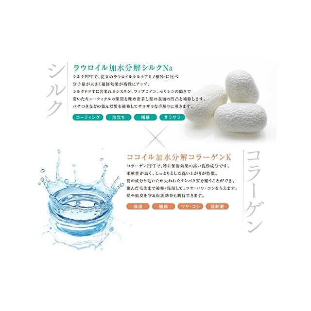 【トリートメント不要、でもきしみません】 「PPTコラーゲン&シルクシャンプー」は髪の補修などのトリートメントの働きがある洗浄成分、ココイル加水分解コラーゲンK及びラウロイル加水分解シルクNaに加えトリートメント成分ペリセア(ジラウロイルグルタミン酸リシンNa)、ヘマチン、羽毛ケラチン、加水分解コラーゲンが髪内部に浸透。髪にはり、こし、うるおいを与えることにより、トリートメントのいらない、きしまないシャンプーが実現しました。 さらに、トリートメントを使用しないことにより、節水がされ排水も汚さくなり環境にもとても優しくなります。