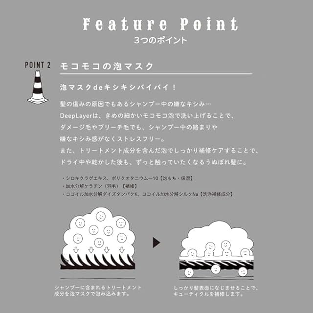 高い保湿力と粘性:もっちりなめらかな泡質で、洗髪時の髪同士の摩擦を軽減します。