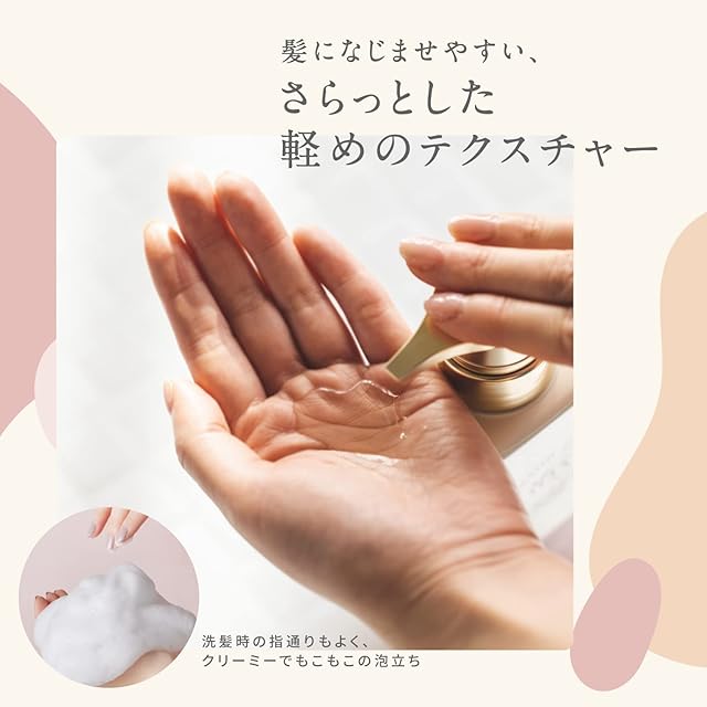 【テクスチャー・使用感】 髪になじませやすい、さらっとした軽めのテクスチャー。洗髪時の指通りもよく、クリーミーでもこもこの泡立ちです。