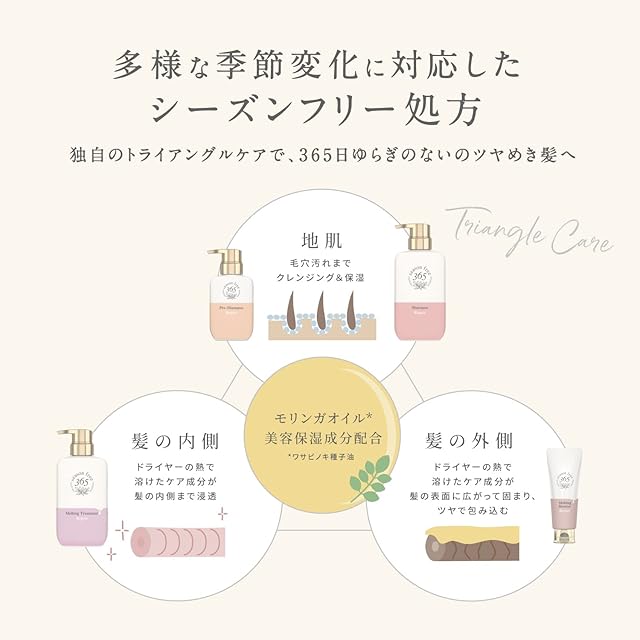 【多様な季節変化に対応したシーズンフリー処方】シリーズ使いすることで地肌・髪の内側・髪の外側の3方向からの独自のトライアングルケアによって、季節の髪ストレスをケアし、1年中ゆらぎのないツヤめき髪へ導きます