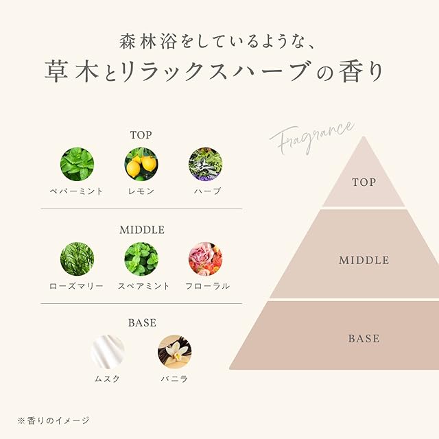 【すっきり爽やかな香り】 森林浴をしているような、草木とリラックスハーブの香り(ペパーミント・ローズマリー・ムスク)