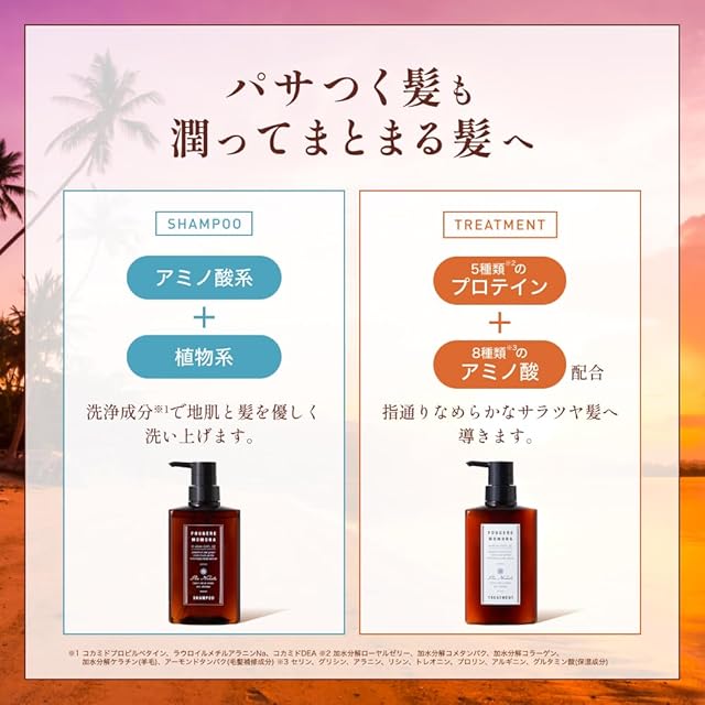 【こだわり処方のシャンプー&トリートメント】アミノ酸+植物系の洗浄成分で地肌と髪を優しく洗い上げます。5種類のプロテイン、8種のアミノ酸配合でダメージを補修し広がりにくく艶やかな髪に。