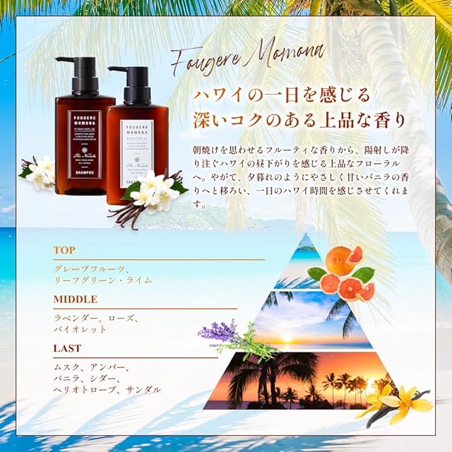 【深いコクのあるフゼアモモナの香り】フレッシュなシトラスグリーンのトップノートにラベンダー、ローズなどのフローラルブーケのミドルノートに加え、ムスクを中心にした深いフゼアのラストノートでまとめた甘くコクのあるフゼア調の香りです。