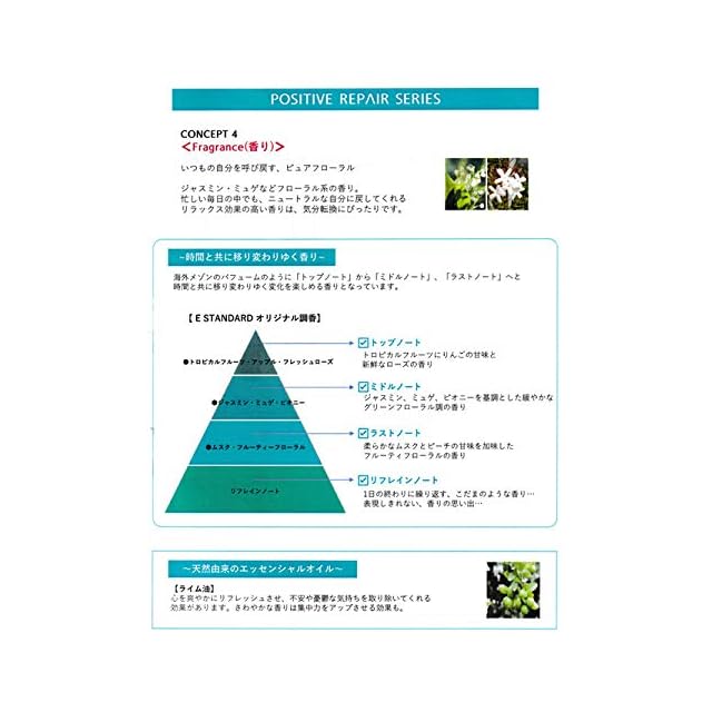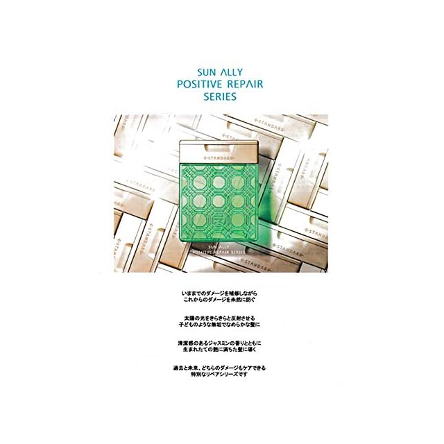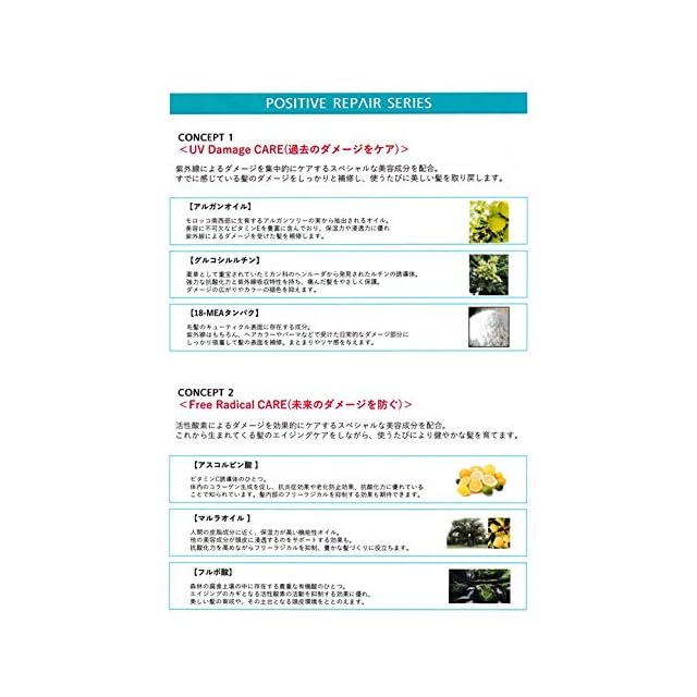 いままでのダメージを補修しながら これからのダメージを未然に防ぐ 太陽の光をきらきらと反射させる 子どものような無垢でなめらかな髪に 漬潔感のあるジャスミンの香りとともに 生まれたての艶に満ちた髪に導く 過去と未来、どちらのダメージもケアできる 特別なリぺアシリ一ズです