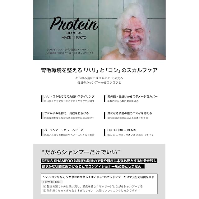 頭皮や髪は本来適度な油分があることで正常が保たれます。洗浄力が強すぎると乾燥しパサつき、フケや痒みを伴い皮脂の過剰分泌による臭いやニキビなどの原因となってしまう可能性があります。DENIS SHAMPOOは適度な洗浄力で髪や頭皮に本来必要な油分を残し、健やかな状態に近づけるのが特徴です。ハリやコシを与え、しかも艶とマトマリを感じられるのでシャンプーだけで十分完結できるのです。