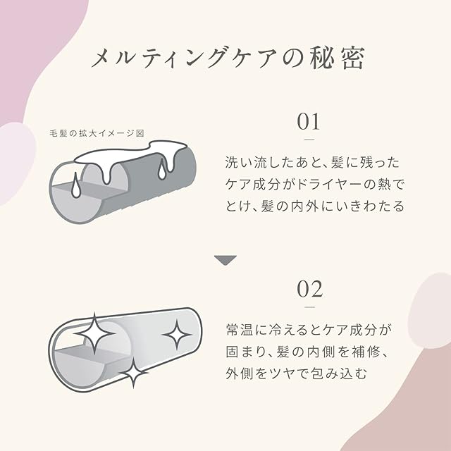 【メルティングケアの秘密】 リッチなケア成分がドライヤーの熱でとけ、髪の内外にいきわたり、常温に冷えるとケア成分が固まり、髪の内側を補修、髪の外側をツヤで包み込みます