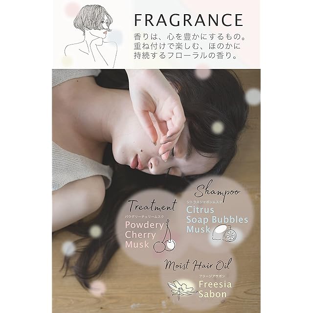 《 重ね付けでたのしむ香り 》香りは、心を豊かにするもの。重ね付けで楽しむ、ほのかに持続するフローラルの香り。[ シャンプー:シトラスシャボンムスク / トリートメントの香り:パウダリーチェリームスクの香り ]