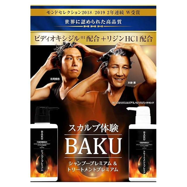 BAKUシャンプープレミアムは、ボリュームが気になる方向けの頭髪ケアシャンプーです。 ふさふさ成分であるピディオキシジル(ピロリジニルジアミノピリミジンオキシド)と、リジン塩酸塩のダブル配合で、ハリ・コシあふれるすこやかな毛髪を実現します。尚、やさしい洗浄力が特徴のアミノ酸系シャンプーであるBAKUシャンプープレミアムは、石油系界面活性剤やシリコン・合成着色料は一切使用していません。 ▼ピディオキシジル(ピロリジニルジアミノピリミジンオキシド) ボリュームあふれるフサフサ感へと導くスカルプ成分です。 ▼リジン塩酸塩 毛髪の構成成分である必須アミノ酸です。うるおいあふれる、しなやかでツヤのある毛髪に導くスカルプ成分です。