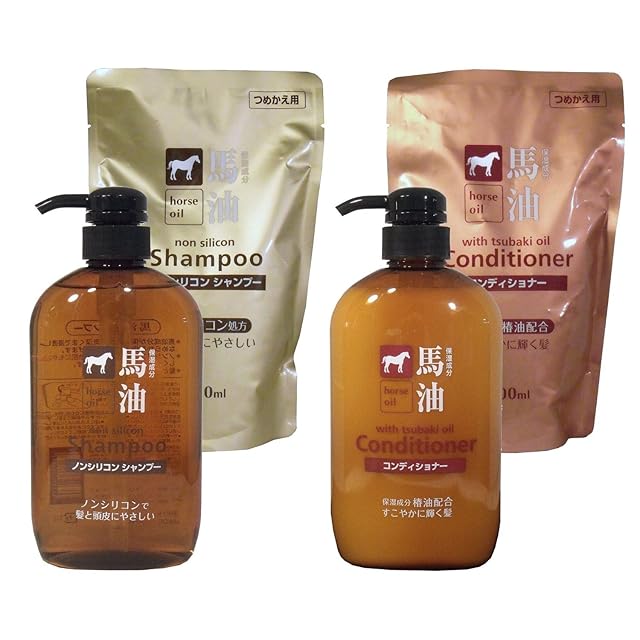 熊野油脂 馬油シャンプー&コンディショナーに詰替え用付きの4点セット 【日本製】