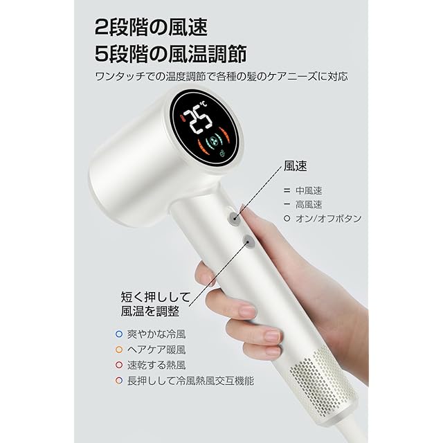 【5段階風温調節・冷風熱風交互機能】2段階の風速、5段階の風温調節、ワンタッチでの温度調節で各種の髪のケアニーズに対応、さらに風温ボタンを長押しして冷熱循環機能で頭皮の温度上昇を防ぎ、柔らかくふんわりとした髪型を簡単に作ることができます。スマートディスプレイ搭載、中風速25℃、45℃、55℃。高風速25℃、60℃、80℃、風温が一目了然。