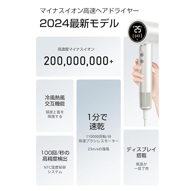 【1分で速乾・高速ブラシレスモーター搭載】大風量、1分で速乾、110000回転/分の高速ブラシレスモーター搭載、23メートル/秒の強力な風速で新しい速乾体験をさせる。1分で短髪が乾燥し、3分で肩の長さの髪が乾燥します。急いでいる朝や忙しい日にも、3分内で髪を素早く乾かすことができます。また、重量わずか380g、軽量かつコンパクトなデザインで、持ち運びに便利です。