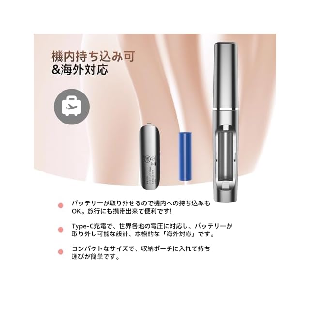 【機内持ち込み可】国内外問わず、電池を外して飛行機に持ち運びができるように。 さらに充電はタイプC対応なので、出先でも充電が簡単にできます。カバンに忍ばせるヘアアイロンです。雨の日の午後も気分があがります。USB充電式だから、ペンケースのように持ち運べます。日頃のケアはもちろんのこと、海外旅行にまであなたのパートナーとして寄り添います。軽量でコンパクトなデザインは、いつでもどこでも持ち運びが簡単です。特に梅雨の時期に、いつでも完璧なヘアスタイルをキープできます。