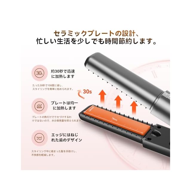 【急速加熱技術】先進のセラミック加熱プレートを搭載し、わずか30秒で即座に加熱。忙しい朝も手軽に理想のヘアスタイルを完成させ、自信を取り戻します。さらに、動かす方向や挟む髪の量に合わせて上下する、3Dクッションプレートを採用します。髪に対して均一に力を入れられて、摩擦が起こりにくく、髪も傷めにくいです。