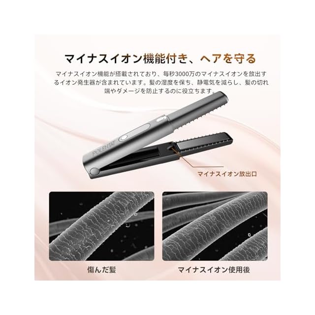 【マイナスイオン機能付き、ヘアケアが簡単】一般的に、髪をスタイリングするには100度以上の温度が必要で、髪が太くしっかりしている場合は200度に達することもあります。しかし、高温は髪のたんぱく質を破壊し、その活性を失わせることで、髪の黄ばみ、枝毛、切れ毛、さらには脱毛を引き起こし、髪の量が減り、質が悪化する原因となります。そのため、ヘアアイロンを選ぶ際には、イオン機能が付いた製品を選ぶことが非常に重要です。この機能は髪へのダメージを最大限に軽減し、ツヤのある髪を保つことができます。ただし、長期間スタイリングを続ける場合は、定期的にヘアオイルを使用してケアすることも必要です。本製品は3000万/cm³のマイナスイオンを瞬時に放出し、静電気や広がりを効果的に抑制します。髪を滑らかでつややかにし、理想のヘアスタイルを持続させます。