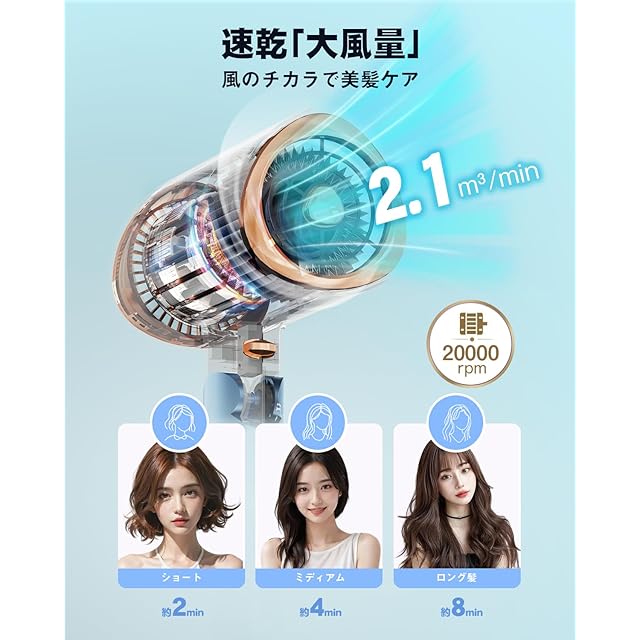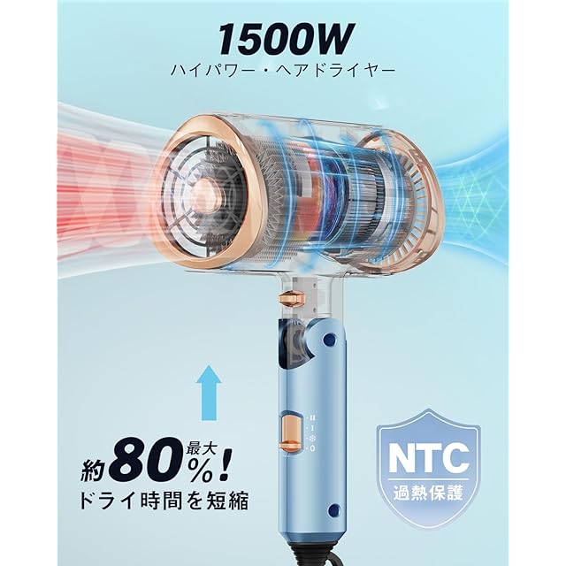 ドライヤー 大風量【2025年春夏限定 美容師監修】速乾 ヘアドライヤー 2000万 マイナスイオン 静電気抑制 57℃恒温 3段階調整 過熱防止 コンパクト 折り畳み 収納ホルダー付属 速乾ノズル ヘアサロン 旅行 1500w ブルー
