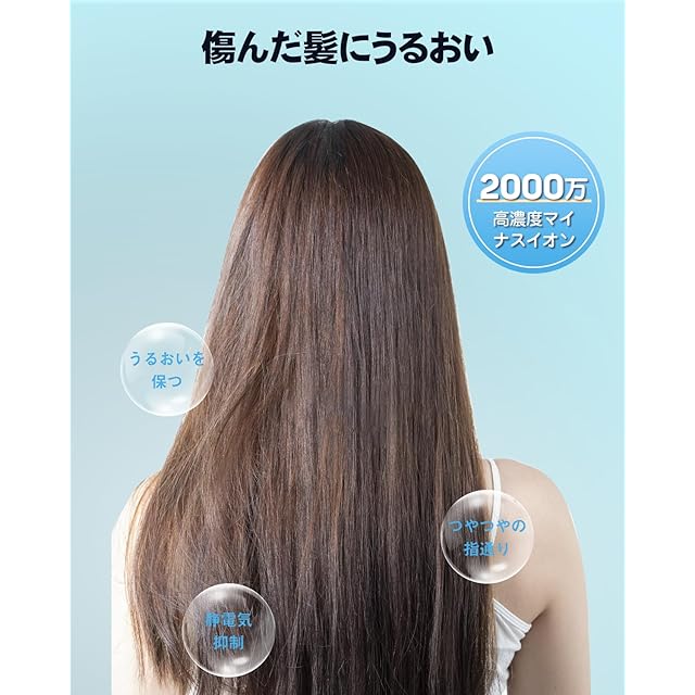 【2000万高濃度マイナスイオン噴射】髪にやさしいマイナスイオンを発生。髪をいたわりながら乾かします。髪の毛がしっとりと潤い、静電気の発生を抑えてくれるので、パサつきや切れ毛、髪の広がりで悩んでいる方におすすめです。