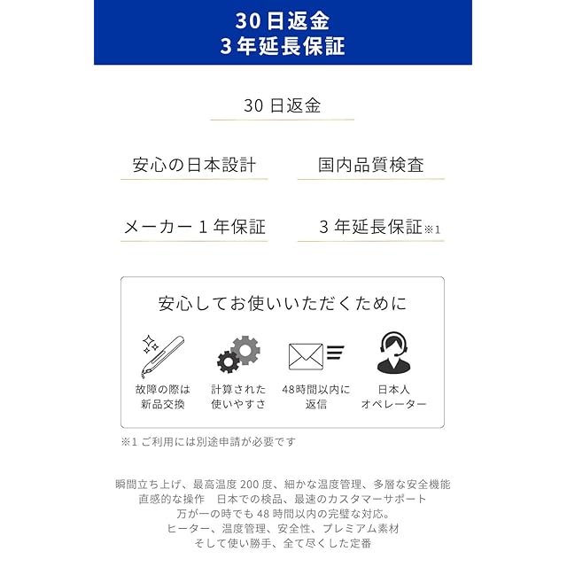 【 品質向上 】コード根本の構造・コードの形状・検品の強化を行いました。ケーブルを一日15回以上折り曲げても2年間持つよう品質管理を実施しています。※コードに1kgの重りを付け、1分間に6回の回転を12000回以上実施。もしトラブルが起きてしまった場合も製品を安心してお使いいただくために、メーカー1年・最大3年をお付けしております。万が一、故障の際は新品交換をいたします。※ PSE(電気製品安全法)適合性検査済み。
