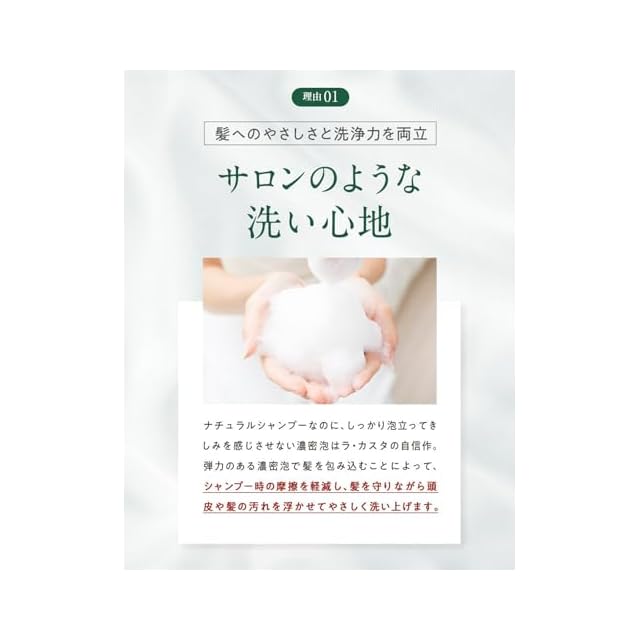 【サロンクオリティ】髪へのやさしさと洗浄力を両立した、サロンのような洗い心地。ナチュラルシャンプーなのに、しっかり泡立ってきしみを感じさせない濃密泡。シャンプー時の摩擦を軽減し、髪を守りながら頭皮や髪の汚れを浮かせてやさしく洗い上げます。