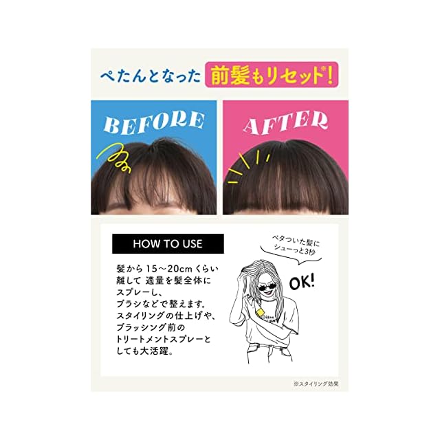 【瞬間リフレッシュ&スタイリング】汗や皮脂によるベタつきを抑え、サラサラふんわりスタイリングをキープします。スタイリングの仕上げや、ブラッシング前のトリートメントスプレーとしても大活躍。髪から15~20cmくらい離して適量を髪全体にスプレーし、ブラシなどで整えます。