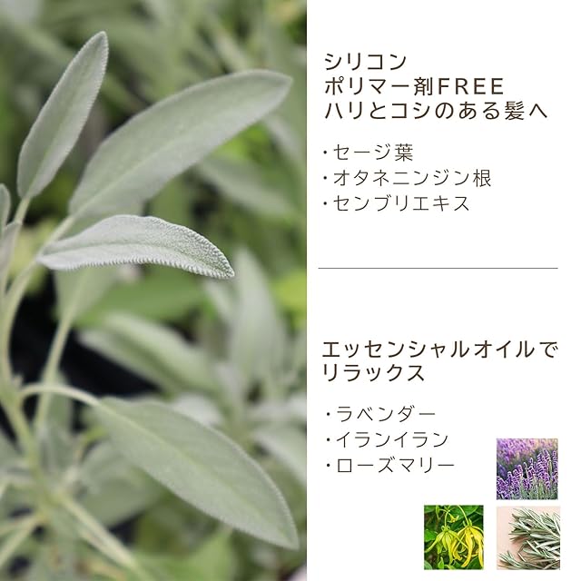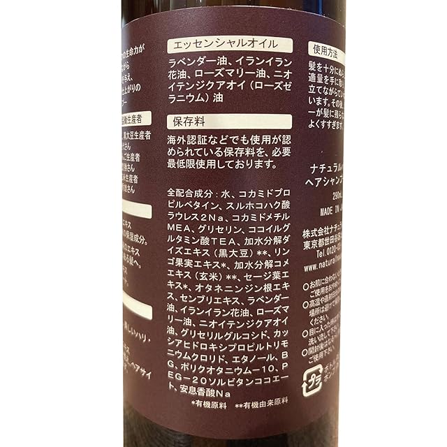 【成分】水、コカミドプロピルベタイン、スルホコハク酸ラウレス2Na、コカミドメチルMEA、グリセリン、ココイルグルタミン酸TEA、加水分解ダイズエキス(黒大豆)**、リンゴ果実エキス*、加水分解コメエキス(玄米)**、セージ葉エキス*、オタネニンジン根エキス、センブリエキス、ラベンダー油、イランイラン花油、ローズマリー油、ニオイテンジクアオイ油、グリセリルグルコシド、カッシアヒドロキシプロピルトリモニウムクロリド、エタノール、BG、ポリクオタニウム-10、PEG-20ソルビタンココエート、安息香酸Na *有機原料 **有機由来原料