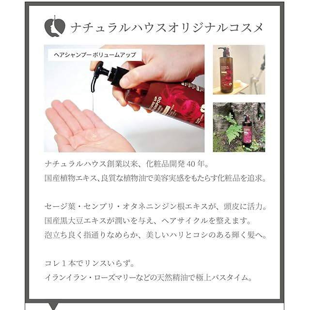 【特長】 洗浄:石油由来の活性剤を一切使用せず、天然由来の成分で頭皮を健やかに洗い上げます。 潤い:合成ポリマーやシリコンを使わない処方で、頭皮の常在菌を守り、健やかな髪の土台を育みます。 さらに、厳選された国産植物エキスと天然精油を使用し、心地よい香りとともに、髪にハリ・コシを与えるボリューム感ある仕上がりを実現。